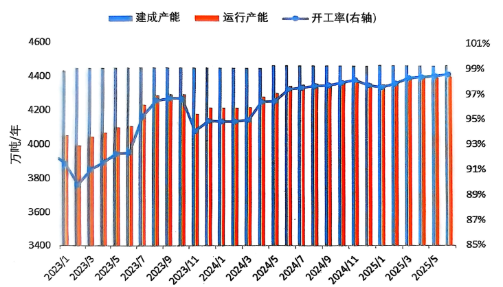 2025上半年,中國鋁行業(yè)生產(chǎn)總體較為穩(wěn)定,沒有出現(xiàn)因各種不可抗力因素導(dǎo)致的規(guī)模化減產(chǎn),且隨著四川、貴州、青海等省/區(qū)電解鋁企業(yè)的復(fù)產(chǎn)和新建項(xiàng)目投產(chǎn),上半年生產(chǎn)能力得到持續(xù)提升。安泰科統(tǒng)計(jì),截至2025年6月底,中國電解鋁建成產(chǎn)能4470萬噸/年,其中運(yùn)行產(chǎn)能4405萬噸/年,較2024年底增加49萬噸。1-6月份產(chǎn)能利用率達(dá)98.1%,不斷刷新歷史新高,比去年同期高2.4個百分點(diǎn):其中6月份產(chǎn)能利用率達(dá)98.5%,較2024年末高0.9個百分點(diǎn)。2025上半年,中國電解鋁產(chǎn)量約為2184萬噸,同比增加2.4%。