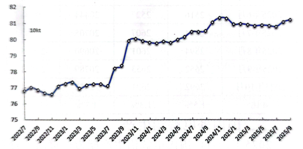 經(jīng)調(diào)整,9月份產(chǎn)量為364.4萬噸;預(yù)計10月份產(chǎn)量為377.0萬噸,同比增長1.3%,日均產(chǎn)量約12.16萬噸。