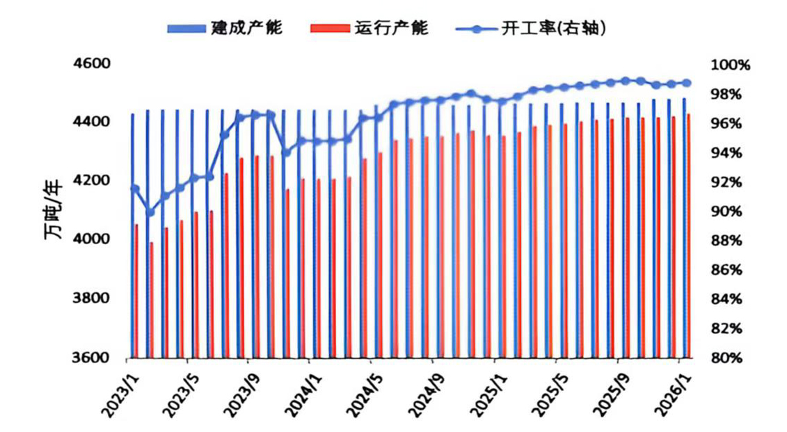 2026年1月,國(guó)內(nèi)電解鋁建成產(chǎn)能與運(yùn)行產(chǎn)能均維持高位運(yùn)行。截至1月底,建成產(chǎn)能4488萬(wàn)噸/年,運(yùn)行產(chǎn)能4434萬(wàn)噸/年,環(huán)比增加9萬(wàn)噸/年,整體產(chǎn)能規(guī)模保持穩(wěn)定,運(yùn)行產(chǎn)能小幅提升。2026年年初,電投能源旗下扎哈淖爾電解鋁二期項(xiàng)目35萬(wàn)噸/年進(jìn)入試生產(chǎn)階段,待項(xiàng)目全面投產(chǎn)后,該公司電解鋁總產(chǎn)能將達(dá)到161萬(wàn)噸;1月上旬,包鋁電解一廠(chǎng)完成1182號(hào)電解槽啟動(dòng),全系列1166臺(tái)電解槽全部運(yùn)行,生產(chǎn)線(xiàn)實(shí)現(xiàn)滿(mǎn)負(fù)荷生產(chǎn);同期,天山鋁業(yè)140萬(wàn)噸電解鋁綠色低碳能效提升改造項(xiàng)目產(chǎn)能逐步釋放。當(dāng)前國(guó)內(nèi)產(chǎn)能已接近“天花板”,行業(yè)開(kāi)工率維持在98%以上,后續(xù)產(chǎn)量釋放與產(chǎn)能擴(kuò)張均已逼近極限。
